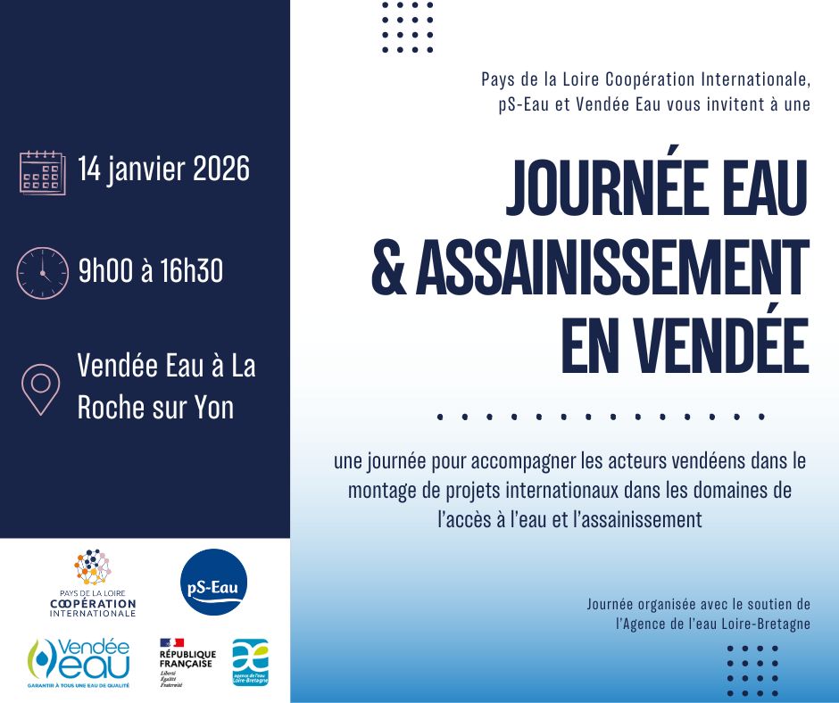 Le mercredi 14 janvier, Pays de la Loire Coopération Internationale en partenariat avec le pS-Eau et le syndicat Vendée Eau, organisent une journée d’information et de formation dédiée au montage de projets Eau & Assainissement en coopération internationale.