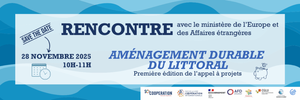 Pays de la Loire Coopération Internationale et SO Coopération, en partenariat avec le Ministère de l’Europe et des Affaires étrangères, vous proposent un temps d’échange en visioconférence le vendredi 28 novembre, pour découvrir l’appel à projets Aménagement durable du littoral, porté par la Délégation pour les collectivités territoriales et la société civile (DCTCIV) du MEAE.
